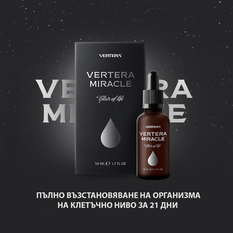 Vertera Miracle съдържа широка гама от биологично активни вещества: взаимозаменяеми и незаменими аминокиселини, вкл. таурин, полиненаситени мастни киселини (омега-3, омега-6), нискомолекулни пептиди, пълен набор от макро и микроелементи. Антиоксидантите, които се съдържат в продукта, са стотици пъти по-силни от наличните за нас и всички познати продукти като витамини С, Е, Коензим Q10 и зелен чай.