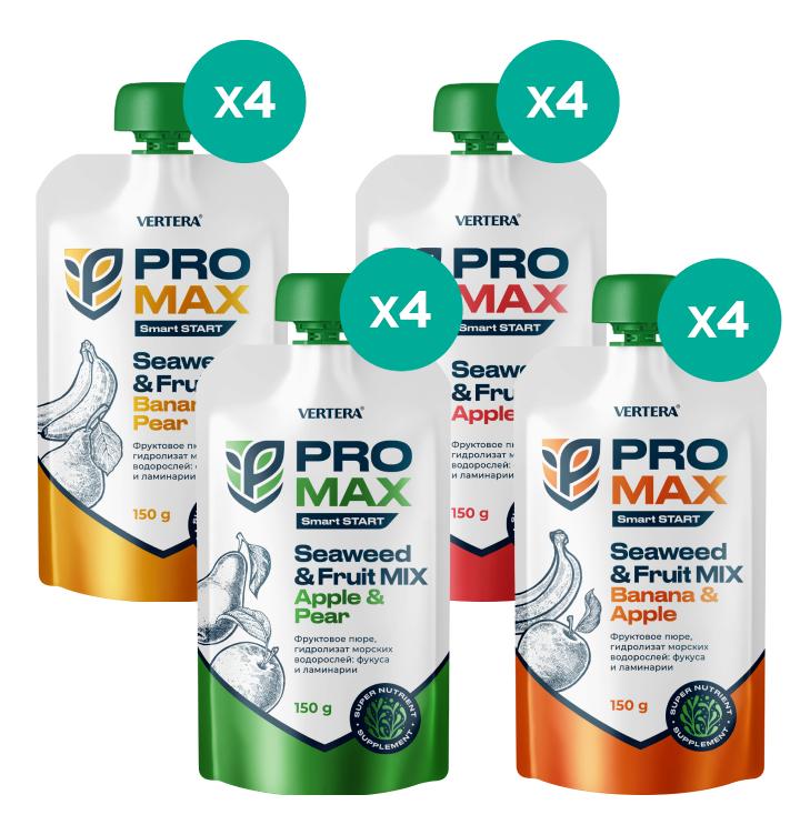 Здравословно хранене с максимална концентрация на полезни вещества на базата на пюре от ябълка, круша, банан, гелове от водорасли ламинария и фукус.